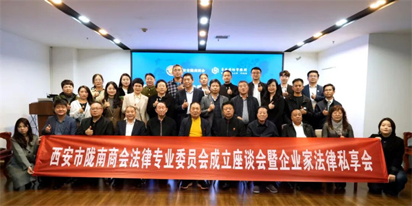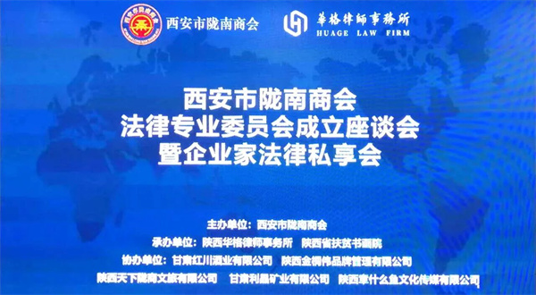 陕商讯:为优化营商环境号召,助力民营企业提升法治化经营水平,10月17日,由西安市陇南商会主办,陕西华格律师事务所、陕西省扶贫书画院承办,甘肃红川酒业有限公司、陕西天下陇商文旅产业有限公司、甘肃利晶矿业有限公司、陕西章什么鱼文化传媒有公司、陕西金铜伟品牌管理有限公司协办的西安市陇南商会法律委员会成立座谈会在西安启航时代广场隆重召开。